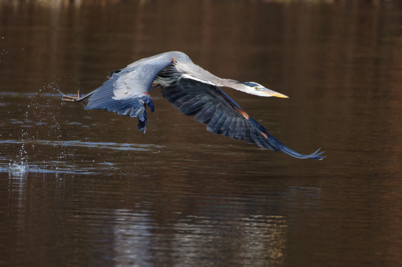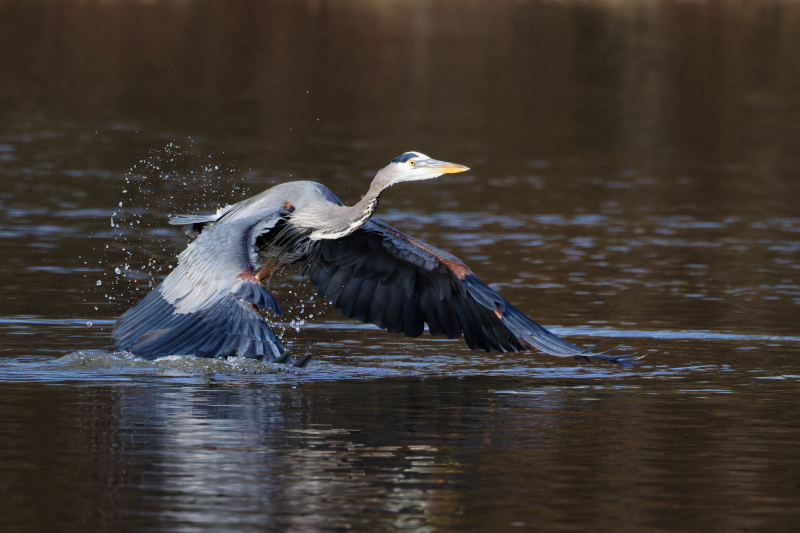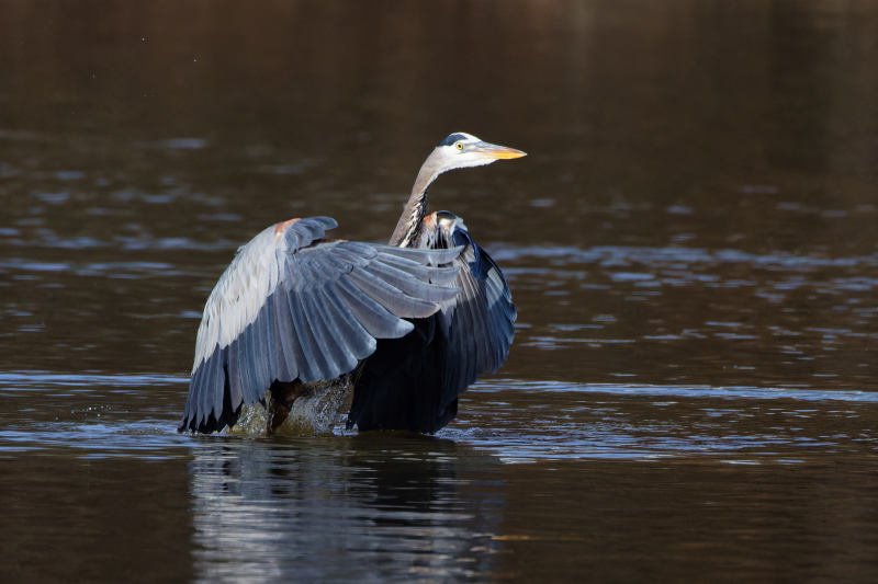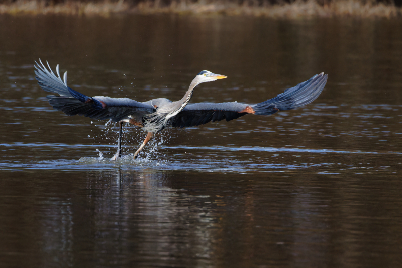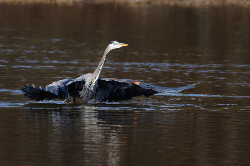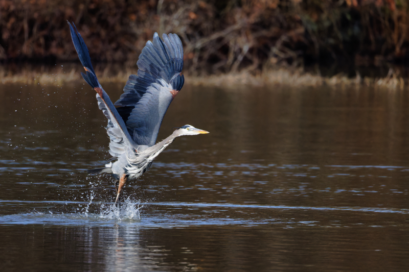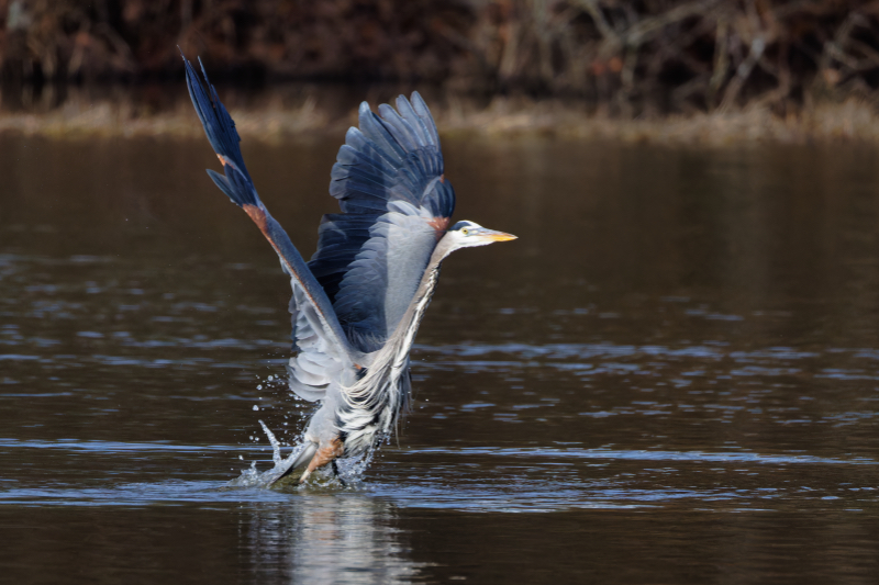 Capturing a Great Blue Heron taking off from the deep section of Charleston Lake in Arkansas was a thrilling experience. The Great Blue Heron, known for its ability to forage in deeper waters and access habitats that are inaccessible to most other heron species, showcases its strength and agility when taking off from deep water.